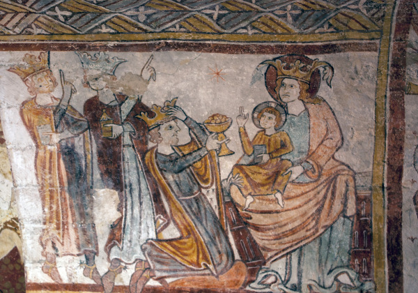 Les siècles postérieurs ont aimé placer cet épisode évangélique (Mt 2) dans le décor de la crèche. Ici, rien de tel. Au contraire, toute la scène insiste sur la splendeur : les mages, devenus des rois dans l’iconographie chrétienne – grâce à la prophétie d’Isaïe (Is 60) – portent leurs couronnes. En face d’eux, la Mère de Dieu est assise sur un trône royal. Elle est plus grande que les autres personnages, sa couronne est aussi plus grande que celles des rois mages et elle a pour fond l’auréole. Représenter une personne plus grande que les autres est une manière typique au Moyen Âge de marquer son importance par rapport aux autres personnages présents dans la scène. C’est une grande Reine qui attire nos regards.
