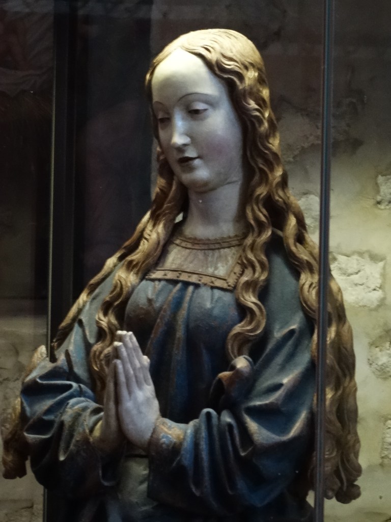 Commençons notre parcours auprès de celle qui fut la première à avoir été mise en chemin : la mère de Jésus. Prenez le temps de vous poser devant la « Vierge de la Collégiale », aussi appelée la Vierge de l’Annonciation.