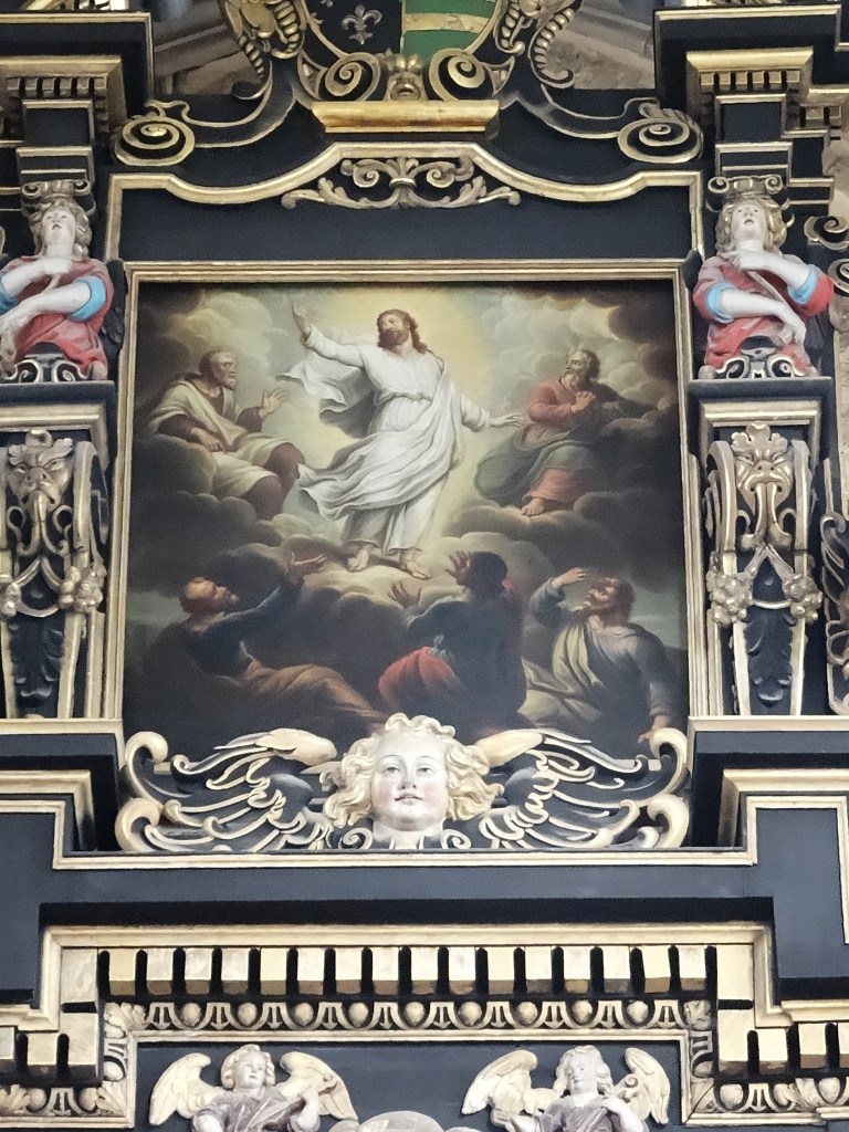 Le tableau de la Transfiguration n’est pas facile à trouver dans la Collégiale : il est au-dessus du bas-relief représentant la crèche de Noël, à droite de l’autel.