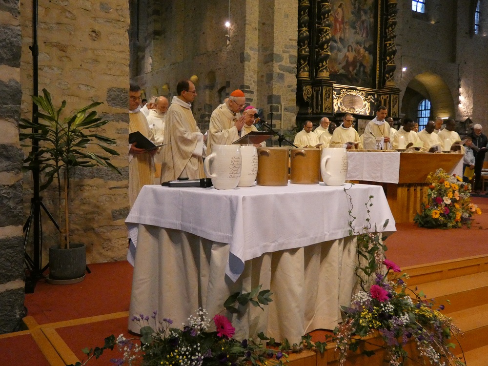 Au moment de l’offertoire, sont amenés en procession, les huiles pour les catéchumènes, puis l’huile pour les personnes malades et enfin l’huile destinée au chrême. Derrière eux viennent ceux qui apportent le pain et le vin. Pour des raisons pratiques, comme par exemple pour que les prêtres puissent repartir avec leurs fioles remplies de l’huile bénie et du chrême consacré, la bénédiction et la consécration peuvent avoir lieu avant la consécration du pain et du vin. Ce que nous ferons ici en Brabant wallon. Alors que le rituel, lui, propose de bénir les huiles à la fin de la prière eucharistique, avant la grande doxologie et de consacrer le chrême à la fin de la célébration. Mais comme tout rituel, il est d’abord au service de la vie et des possibilités réelles.