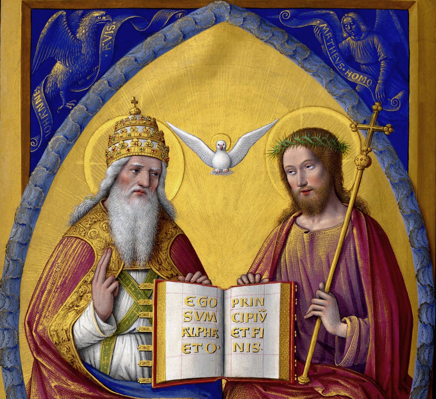 Le Père, le Fils et l’Esprit, soit la Trinité, sont tous les trois représentés sur un écrin d’or en forme de mandorle pour évoquer leur gloire.