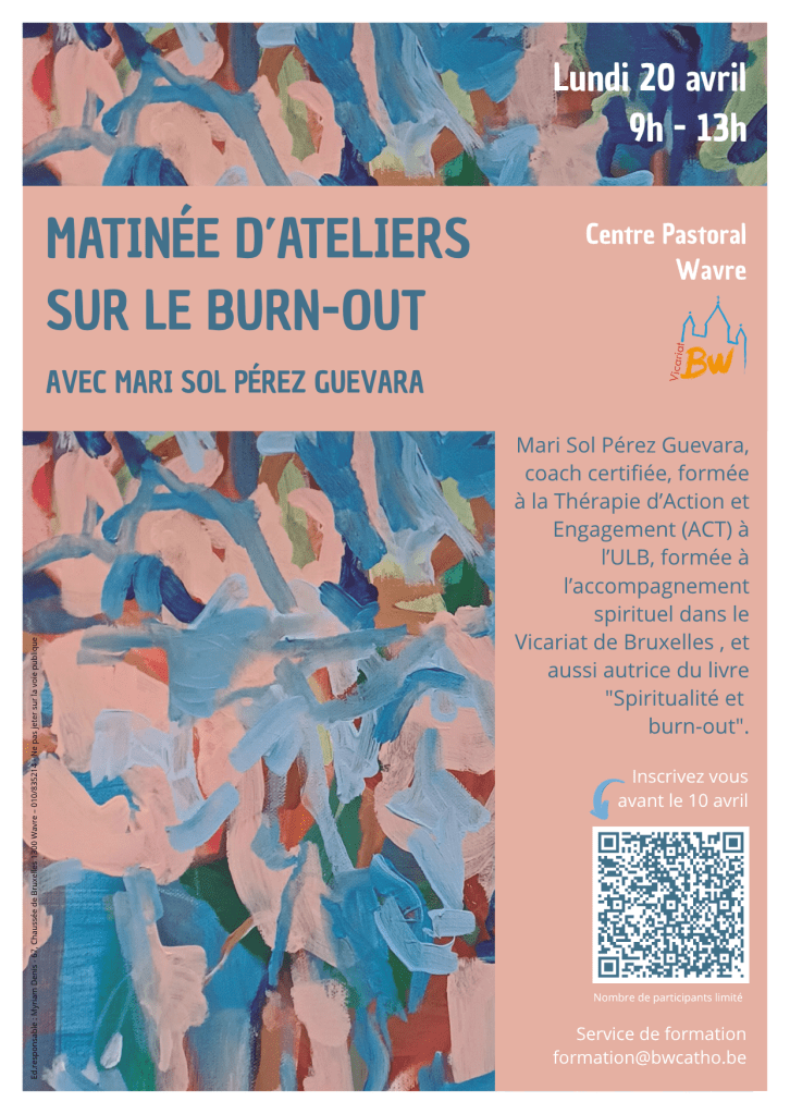 Mari Sol Pérez Guevara, coach certifiée, viendra animer ces ateliers, est formée à la Thérapie d’Action et Engagement (ACT) à l’ULB, formée à l’accompagnement spirituel dans le Vicariat de Bruxelles, et aussi autrice du livre « Spiritualité et burn-out ».