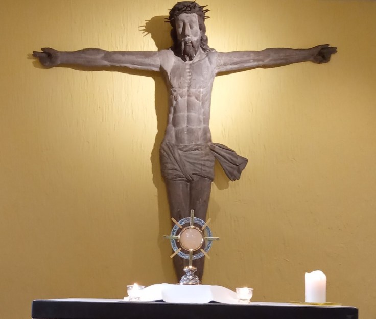 Presque toujours, l’ostensoir est déposé, avec raison, sur l’autel. Celui-ci aussi peut nous aider à entrer dans l’adoration. Il faut avoir assisté à la consécration d’un autel pour comprendre qu’il est bien plus qu’une simple pièce de mobilier ; il symbolise véritablement le corps du Christ mort et ressuscité. C’est aussi à l’autel, au cours de chaque célébration eucharistique, que le pain et le vin deviennent pour nous le Corps et le Sang du Christ et que nous y « faisons mémoire » de la Passion et de la Résurrection de Jésus-Christ, du «sacrifice qui est digne de toi (Le Père) et qui sauve le monde entier » (Prière eucharistique IV). Oui, « il est grand le Mystère de notre foi »…