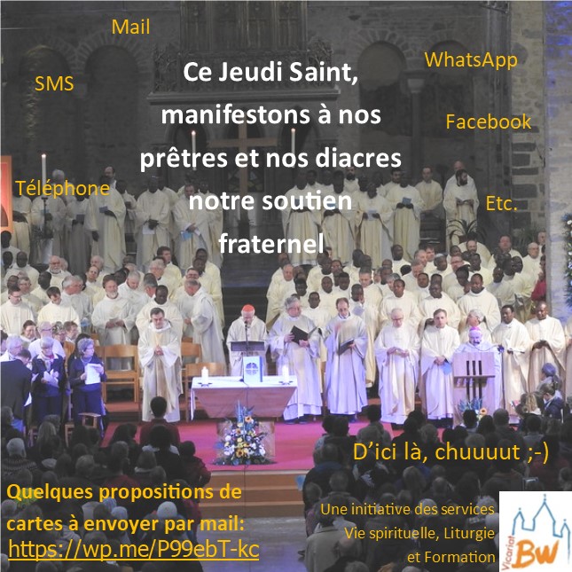 - Nous vous invitons à susciter dans vos paroisses et UP un maximum de gestes fraternels à leur égard, prêtres et diacres. Qu’en ce Jeudi saint, ils croulent sous les signes : SMS, mails, appels téléphoniques, WhatsApp, Facebook, etc. Tous les moyens ‘confinés’ sont bons.